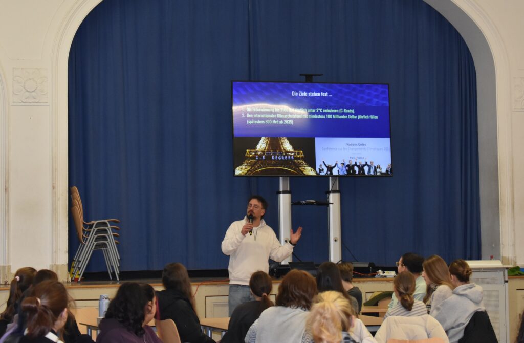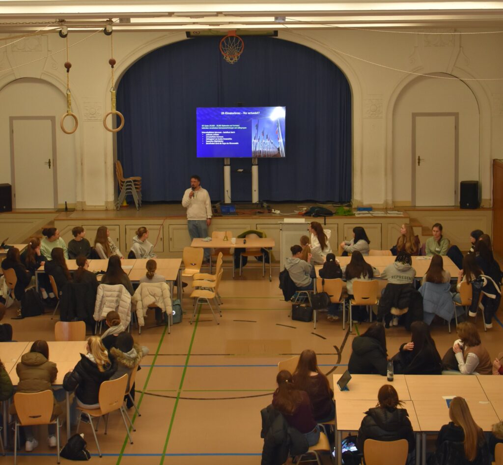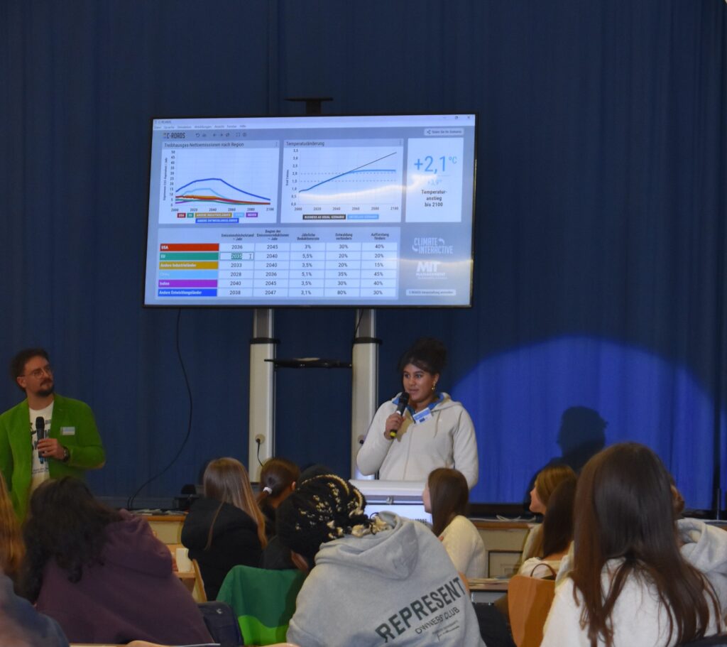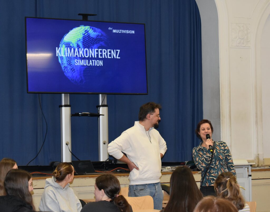 Mithilfe der Multivision e.V. und dank der Unterstützung durch die Sparkasse KölnBonn ohne Kosten für die Teilnehmenden, stellten unsere Schülerinnen der Stufen neun und zehn eine echte UN-Klimakonferenz nach. Ihr Ziel: Als Vertreterinnen verschiedener Ländergruppen durch Verhandlungsgeschick und kluge Entscheidungen die Erhöhung der weltweiten Durchschnittstemperatur bis zum Jahr 2100 auf unter 1,5 Grad begrenzen. Eine schwierige Aufgabe, der sich die Schülerinnen als Verhandlungsführerinnen ihrer Delegationen einen ganzen Vormittag lang stellten. Jede Ländergruppe legte eigene Emissionsziele für fossile Brennstoffe fest und traf politische Entscheidungen im Bereich der Entwaldung, z.B. durch Aufforstung und im Bereich des Landverbrauchs durch Maßnahmen gegen Monokulturen wie Sojaanbau. Sie führten intensive Verhandlungen mit den übrigen Ländervertreterinnen, um durch Zusammenschlüsse einen Klimafonds einrichten zu können. Moderator Max Menkenhagen schlüpfte in die Rolle des UN-Generalsekretärs – natürlich im grünen Sakko – und führte die Teilnehmerinnen durch die Klimakonferenz. Nach intensiven Verhandlungen wurden die Ziele durch die Delegationen im Plenum präsentiert und die Folgen für die Erderwärmung abgemildert.